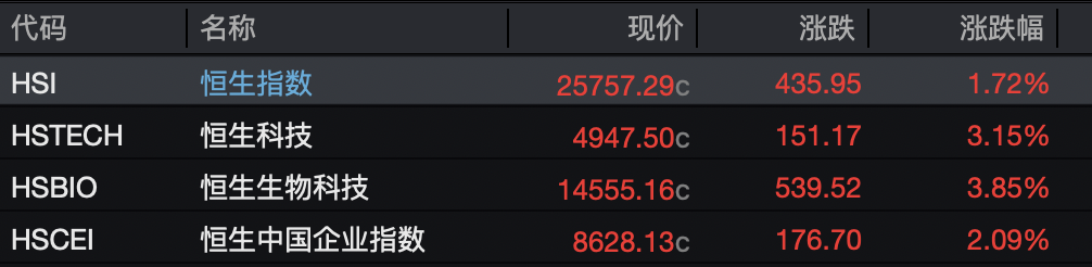 港股三大指数高开高走,截至收盘,恒生科技指数大幅反弹3.15%,恒生指数、恒生国企指数分别上涨1.72%、2.09%。