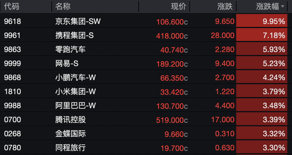 京东集团涨近10%,携程、网易、小米、阿里巴巴等大型科网股均大幅反弹。