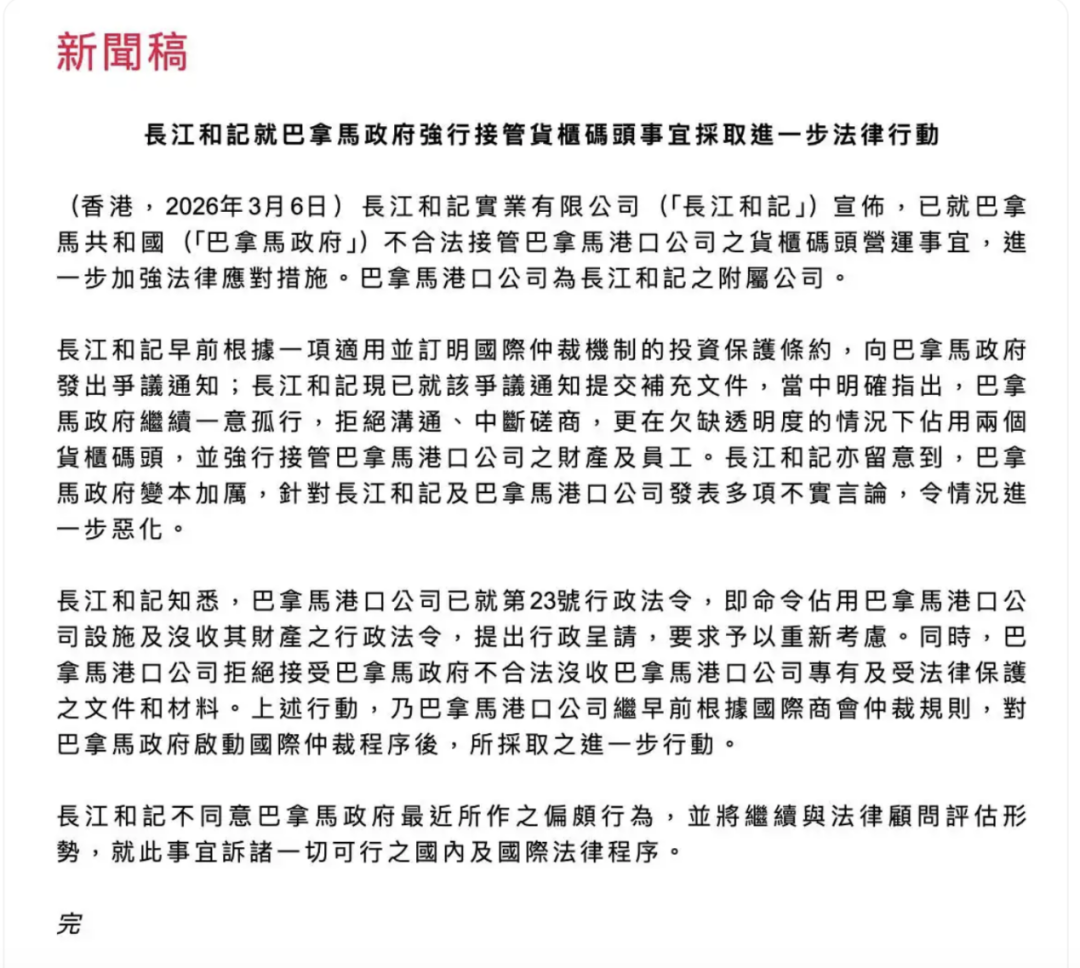 3月6日,长江和记实业有限公司(长江和记)宣布,已就巴拿马政府不合法接管巴拿马港口公司之货柜码头营运事宜,进一步加强法律应对措施。巴拿马港口公司为长江和记之附属公司。