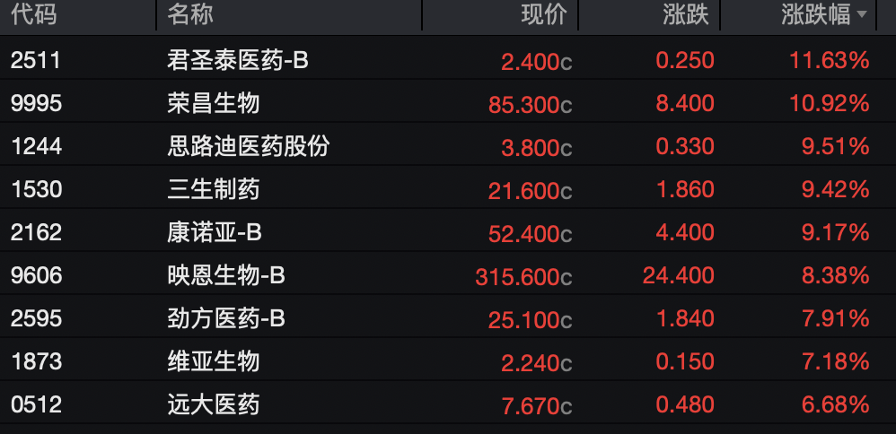 创新药板块全天表现强势。君圣泰医药、荣昌生物涨超10%,思路迪医药股份、三生制药、康诺亚涨超9%。