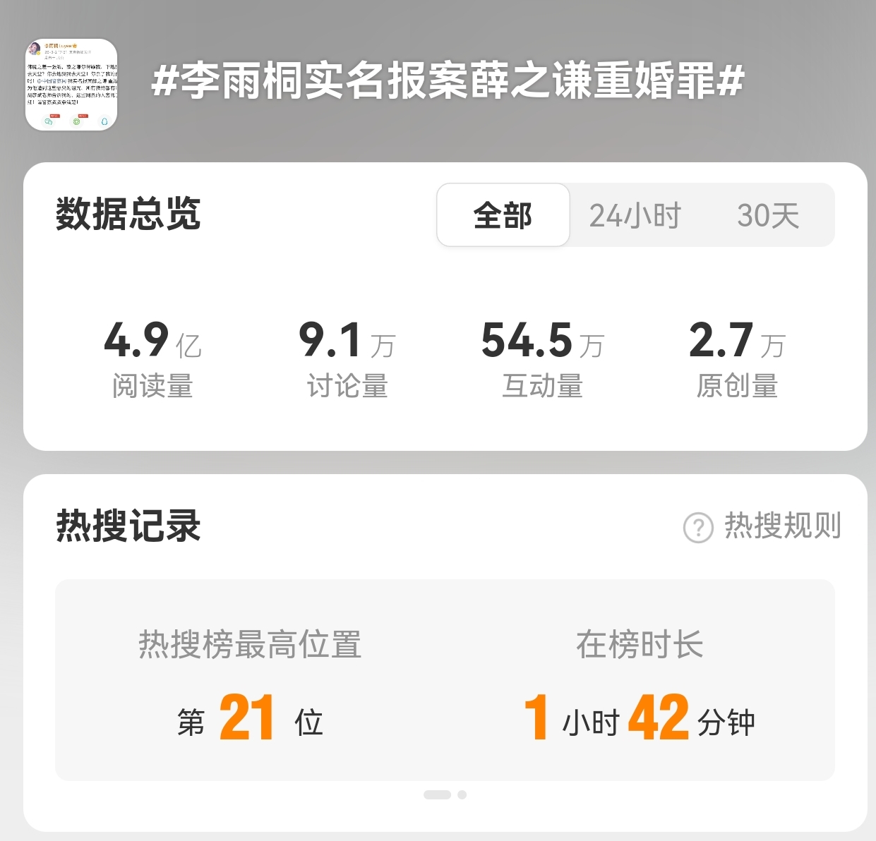 据悉,李雨桐曾在3月2日晚发布涉及薛之谦的微博,相关话题引发网友热议,“李雨桐实名报案薛之谦重婚罪”“李雨桐喊话薛之谦”等词条登上热搜榜。